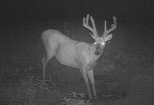History is, the buck showed up in 2013 and appeared on only one camera 2 different days in late July–then we never saw him again. This year he’s been on 2 cameras every couple days since June when we able to identify him (we run cameras year-around).